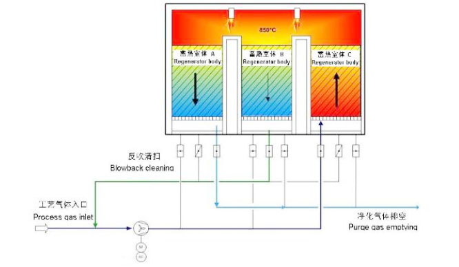 RTO蓄熱式燃燒裝置用于有機(jī)廢氣的高效處理,VOC廢氣在引風(fēng)機(jī)作用下進(jìn)入RTO陶瓷蓄熱室,經(jīng)蓄熱室換熱后溫度升至約800℃,廢氣中的VOC氧化分解成二氧化碳和水。氧化產(chǎn)生的高溫氣體流經(jīng)特制的陶瓷蓄熱體,使陶瓷體升溫而“蓄熱”,此“蓄熱”用于預(yù)熱后續(xù)進(jìn)入的有機(jī)廢氣。從而節(jié)省廢氣升溫的燃料消耗。陶瓷蓄熱體應(yīng)分成兩個(含兩個)以上的區(qū)或室,每個蓄熱室依次經(jīng)歷蓄熱-放熱-清掃等程序,周而復(fù)始,連續(xù)工作。VOC去除率在95%以上。